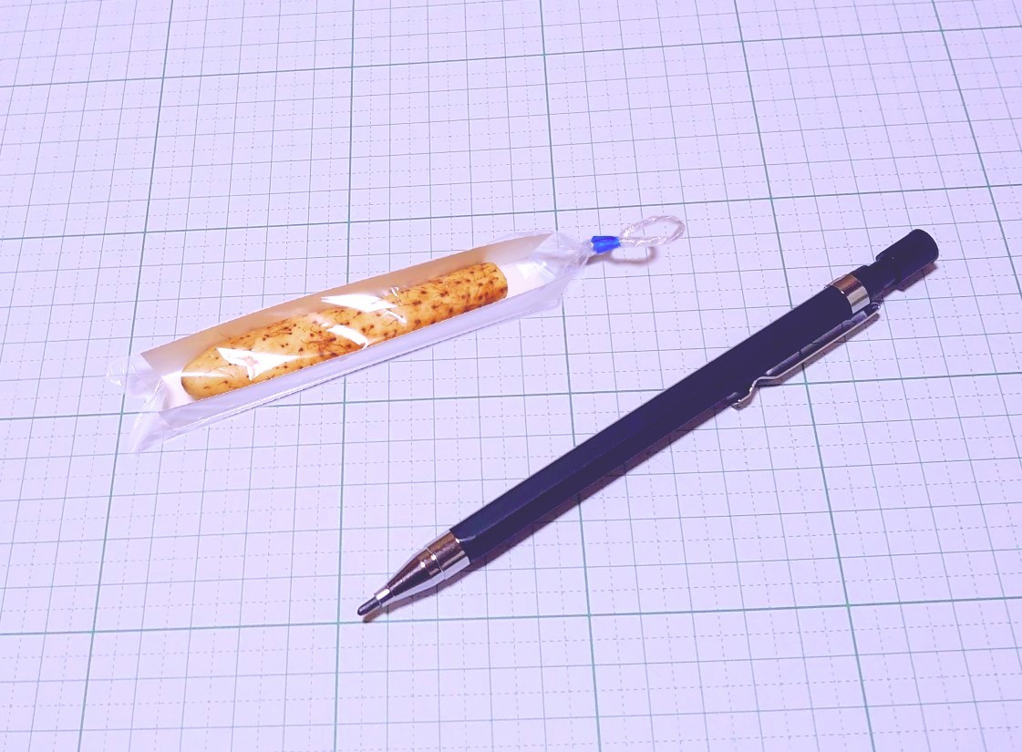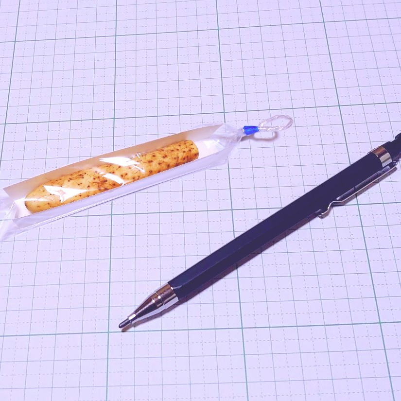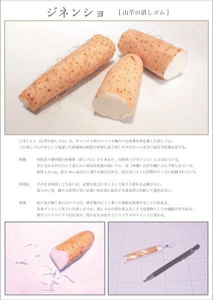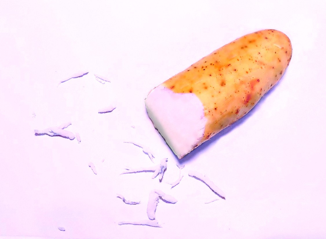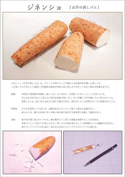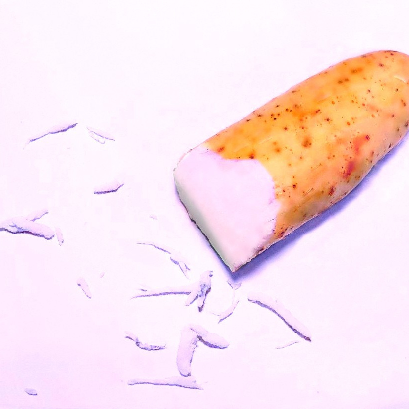 山芋の消しゴム。内側は粘度の高いゴム、外側はやや硬いゴムで作られている。柔らかいゴムは、紙を傷めにくく多くの黒鉛を吸着することが出来る。消すというマイナスな行為が、何かを生み出すというプラスのマインドに変わる。