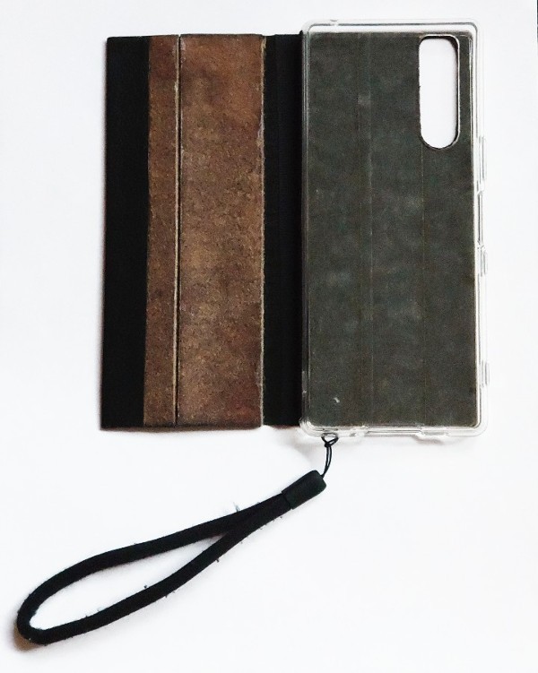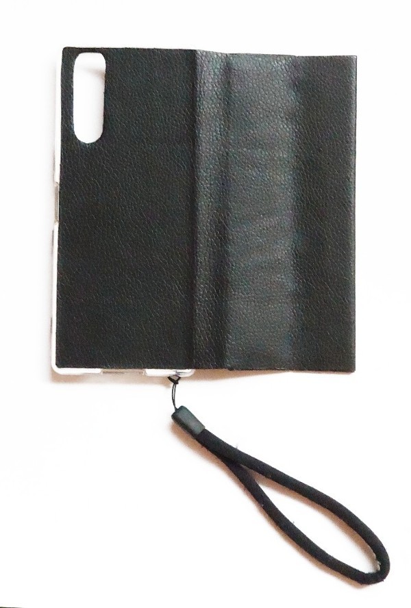 ✔手帳部分は、ケースより小さい。✔合成皮革で薄く軽い。✔ストラップホールは下部。✔カード入れは無しで、折り畳める。✔ボタン留め、磁石も無し。✔手帳部分に触れずに持てる。