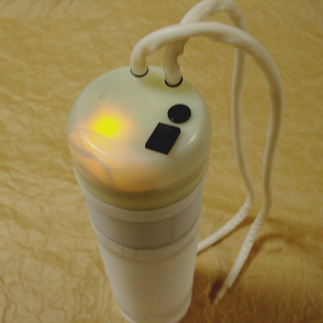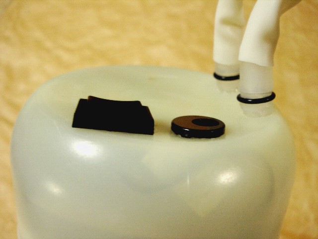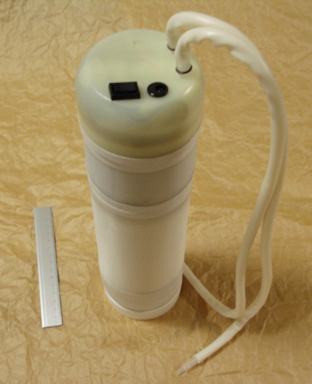 上部にロッカースイッチ(on-off-on)[充電-オフ-起動]。 充電用DCジャック。ポンプ吸水、排水口。