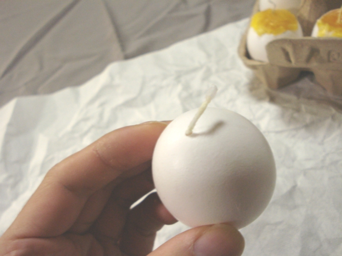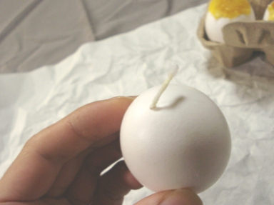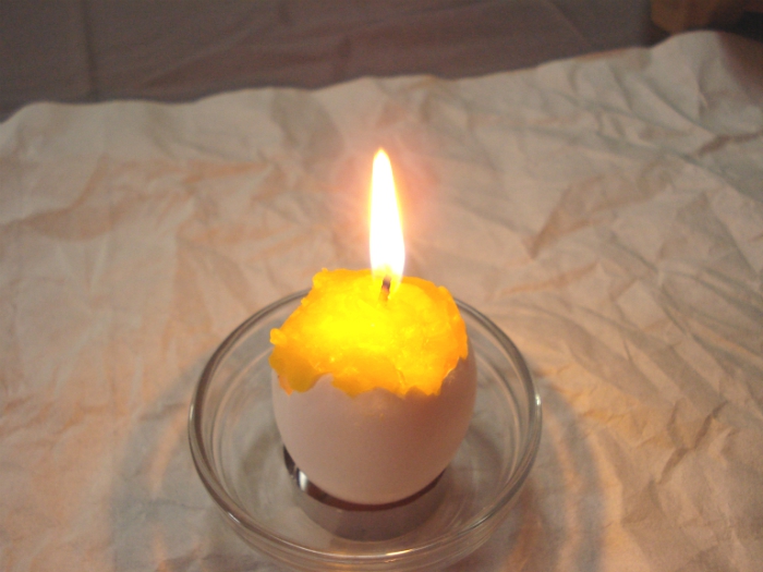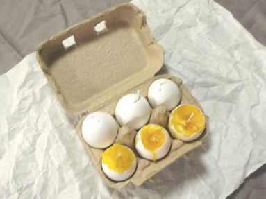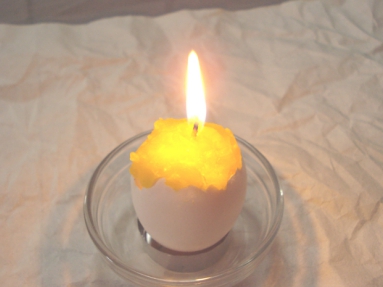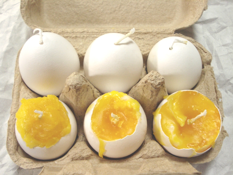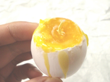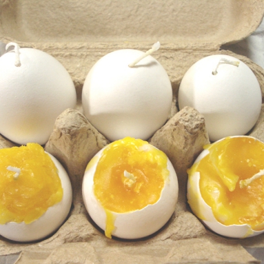 卵型のローソク。既出のアイテムだが、黄身と白身の比率を工夫する事で、半熟卵を割った様な演出が可能。アロマキャンドルとしても使用可能。 燃焼約8時間。