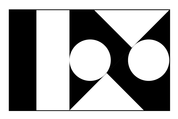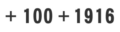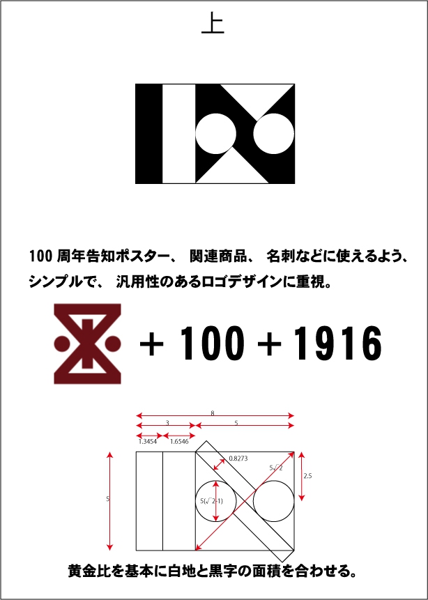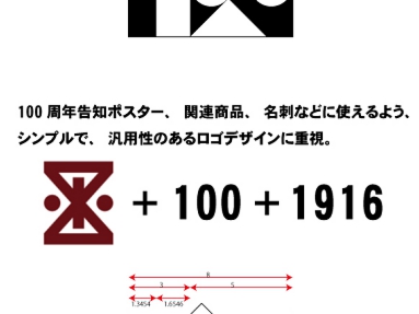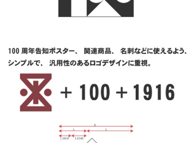図形+100+1916 を取り入れたロゴマーク。白地と黒字の面積を等しくし、配置バランスを考慮。サイズ、白黒印刷にも配慮したシンプルロゴ。