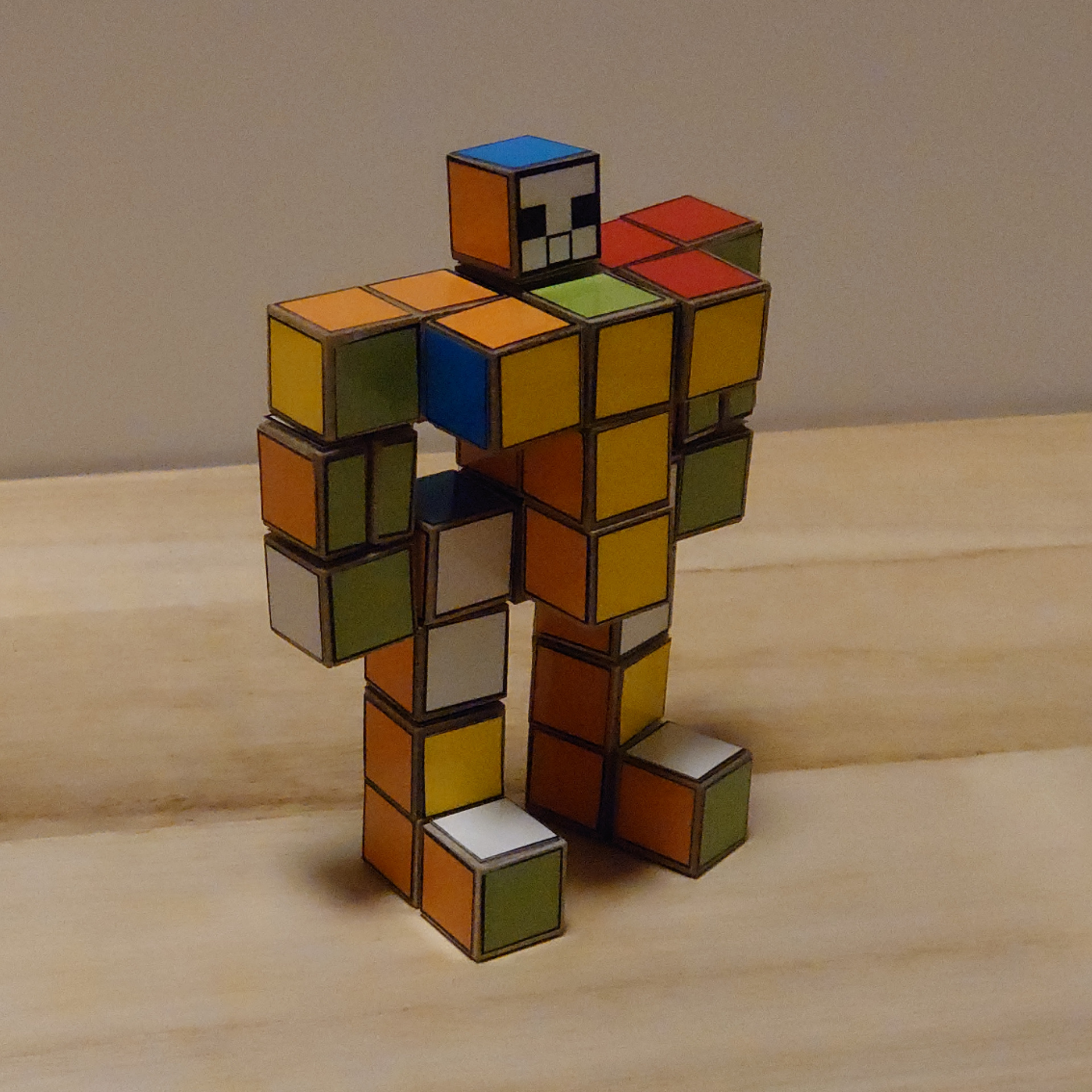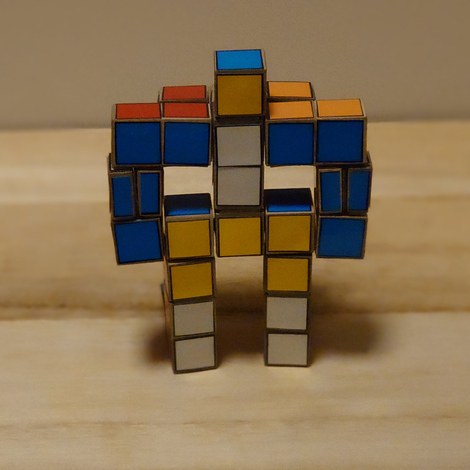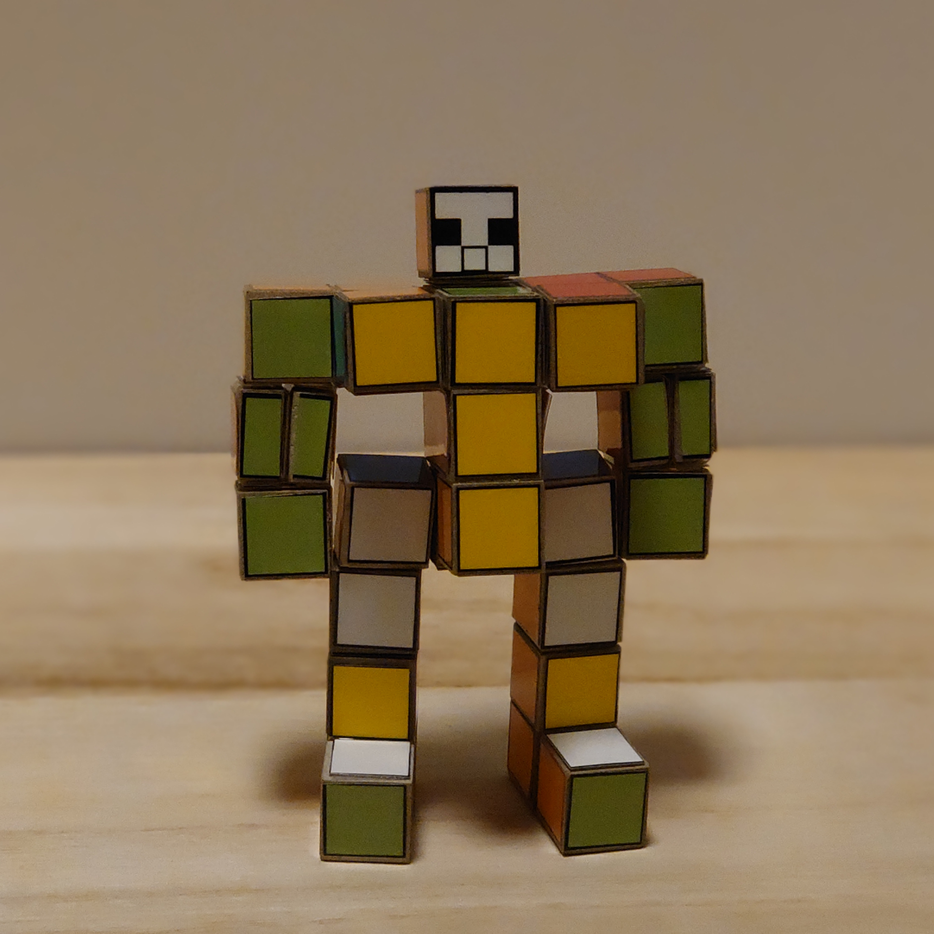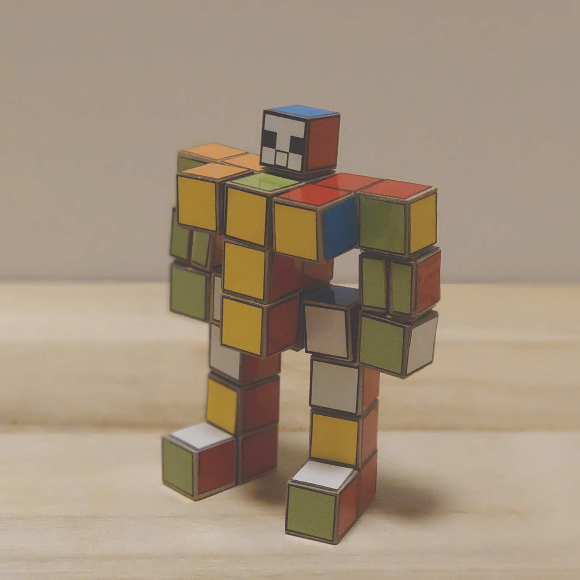 ルービックキューブからの変身ロボットの玩具。連結部分は粘着テープと磁石を利用しています。ポーズが固定なので遊べないのが欠点。