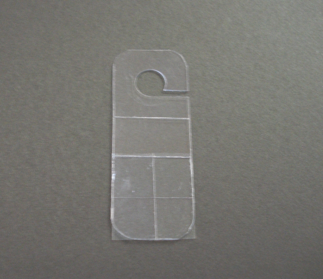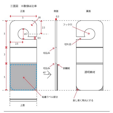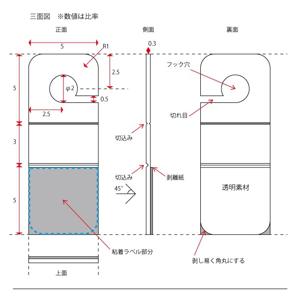 フック陳列をする為のシール。既に”フックシール”として流通しているアイテムです。三面図も用意した後なので、掲載します。