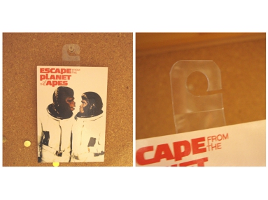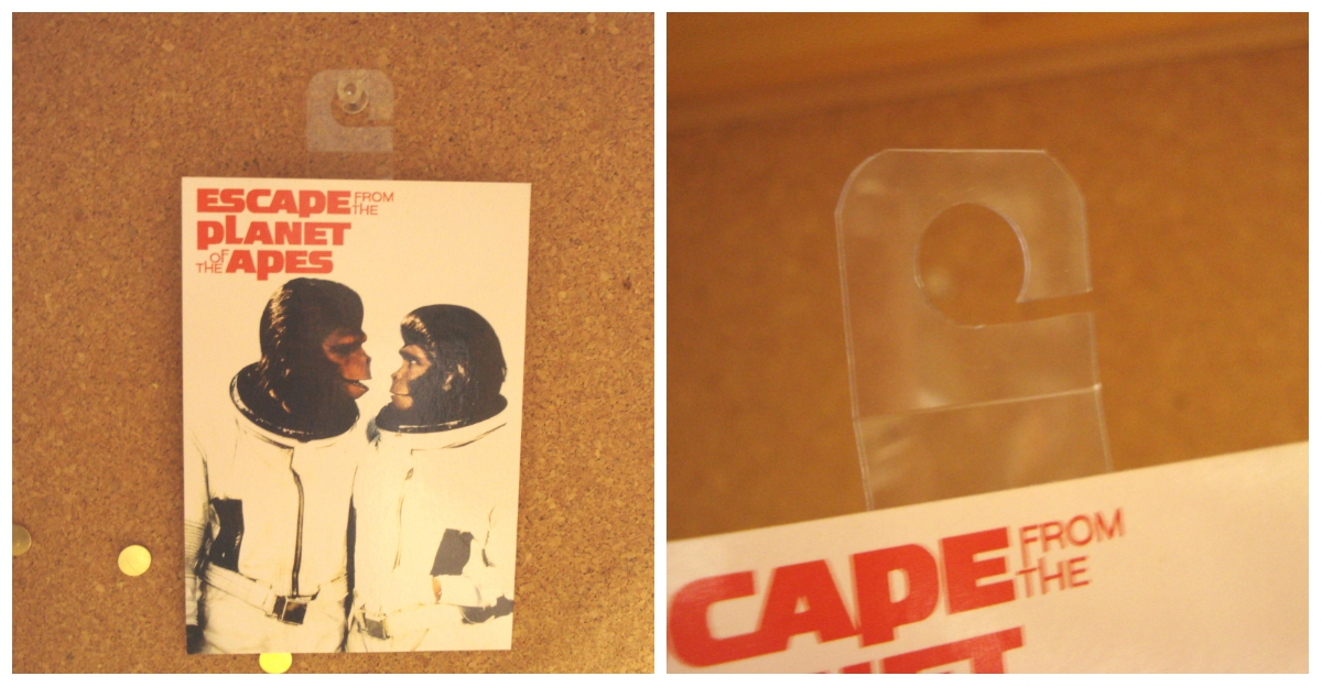 写真やポスターに貼り付け、押しピンにかける。両面テープを交換すれば再利用可能。