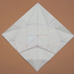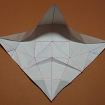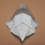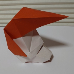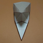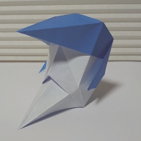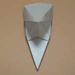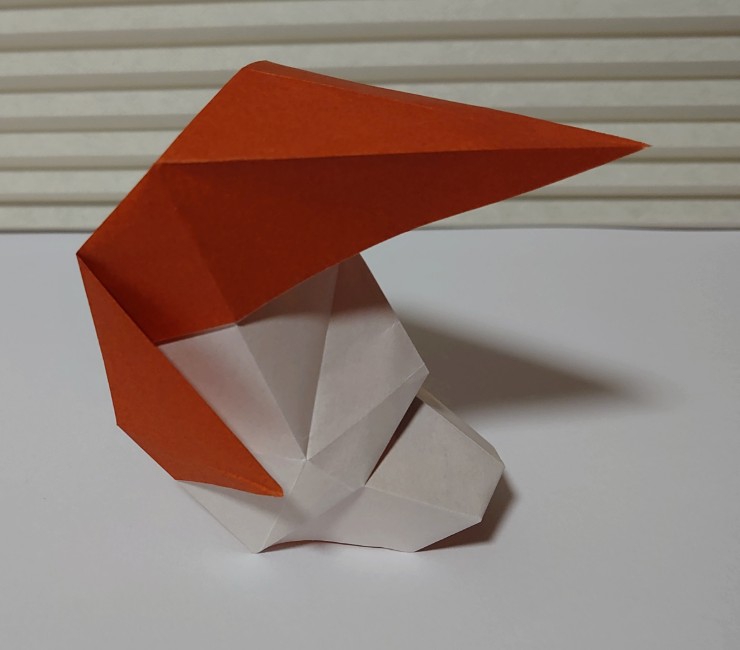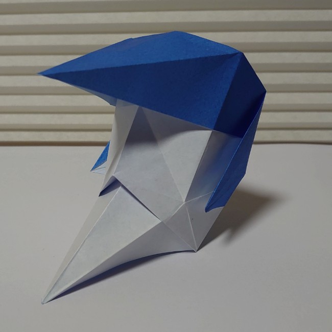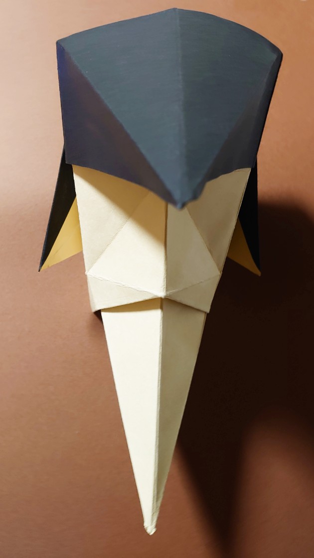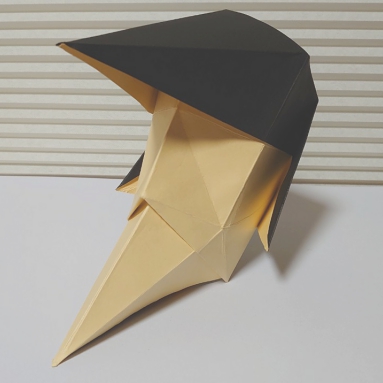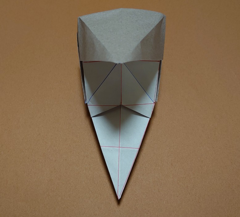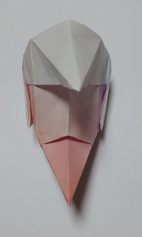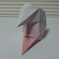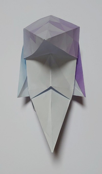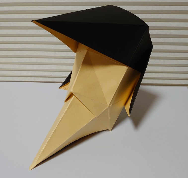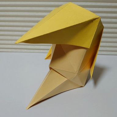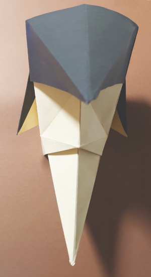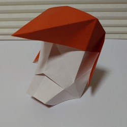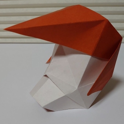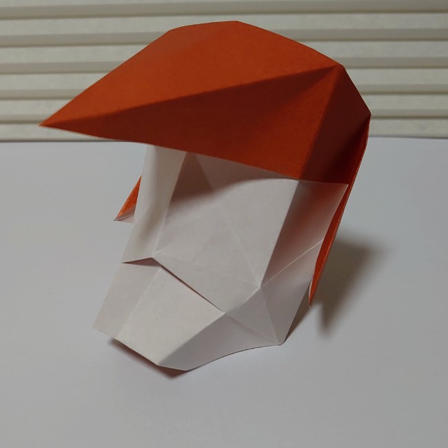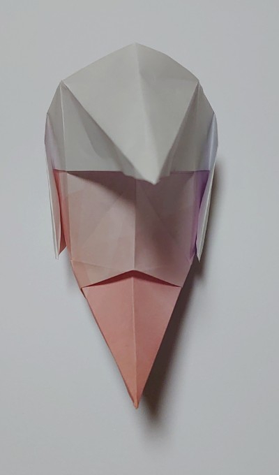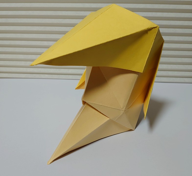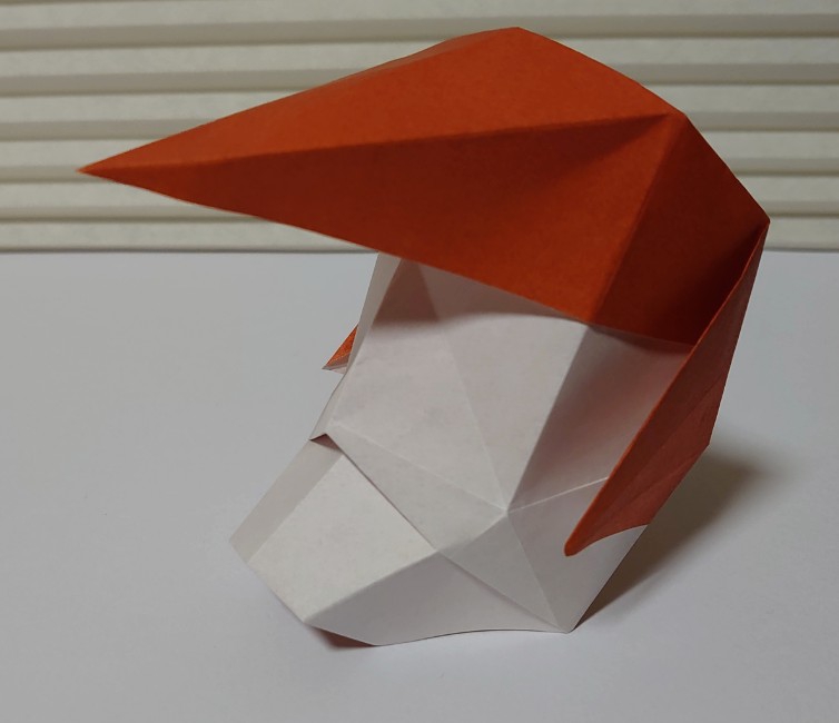 折り紙のお面。ポンパドールの髪型と尖った顎が特徴。鶴の折り方がベースで簡単に作れます。