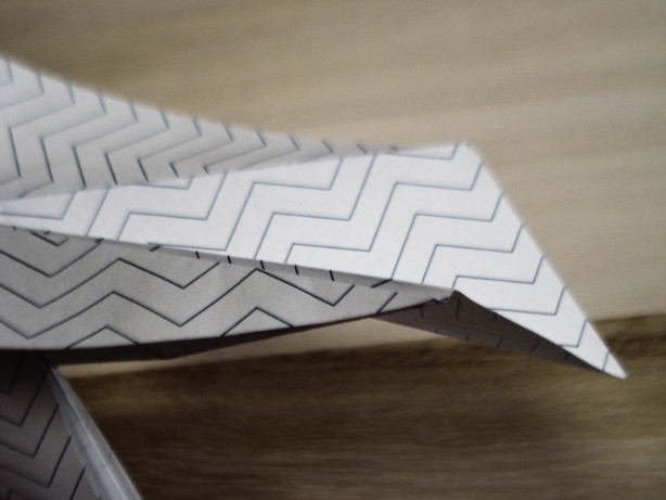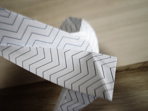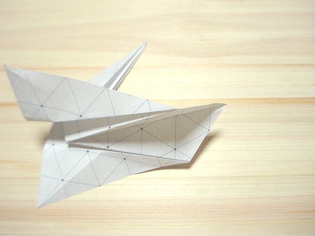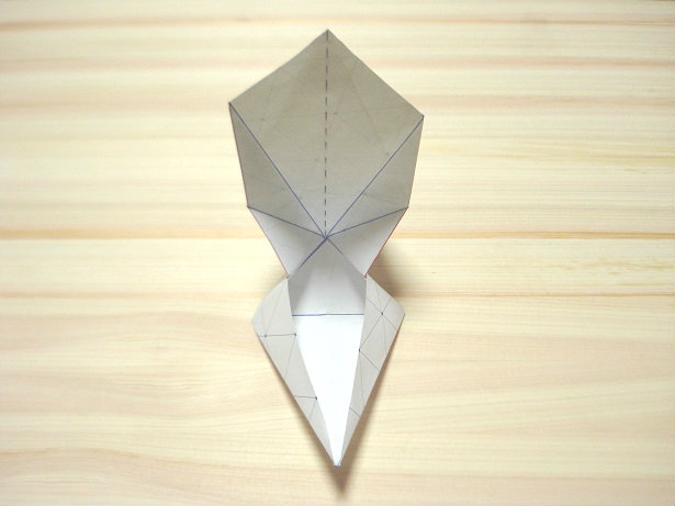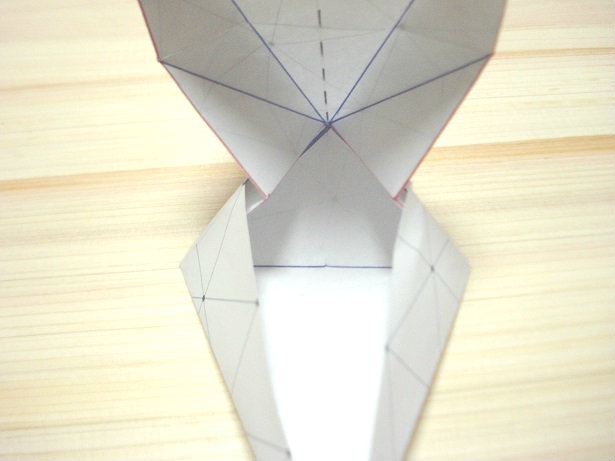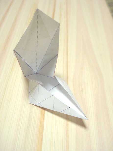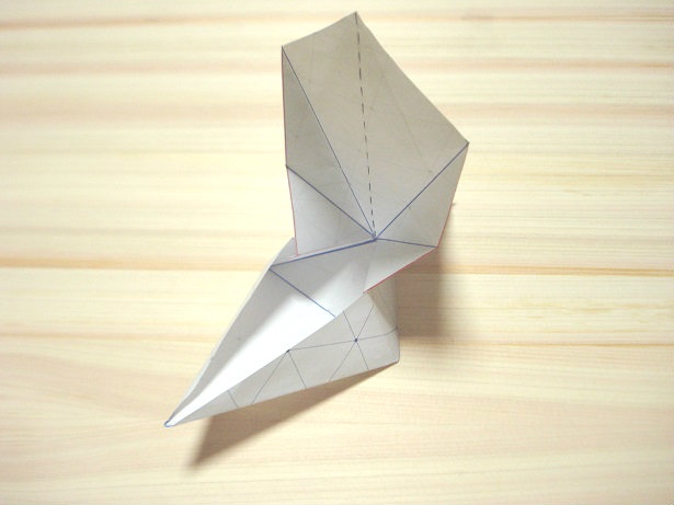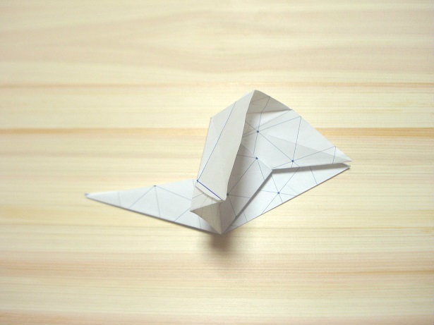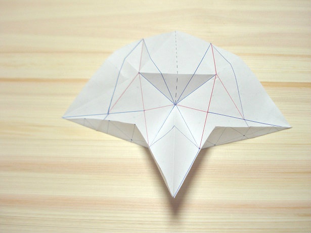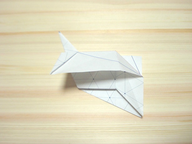 ここで、船尾の所まで折り目を付けます。 折り目付けは終わりです。