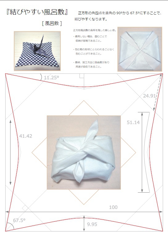 結びやすい風呂敷。正方形風呂敷の長所を残した新しい形。正方形の角四点を直角の 90°から67.5°にすることで、結びやすくなります。