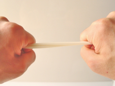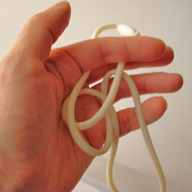 安全パーツで連結しています。伸縮性があり、シリコーンゴムと二重構造なので、急な戻りは無く安全です。
