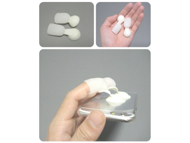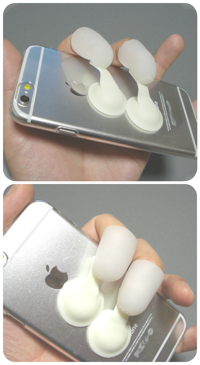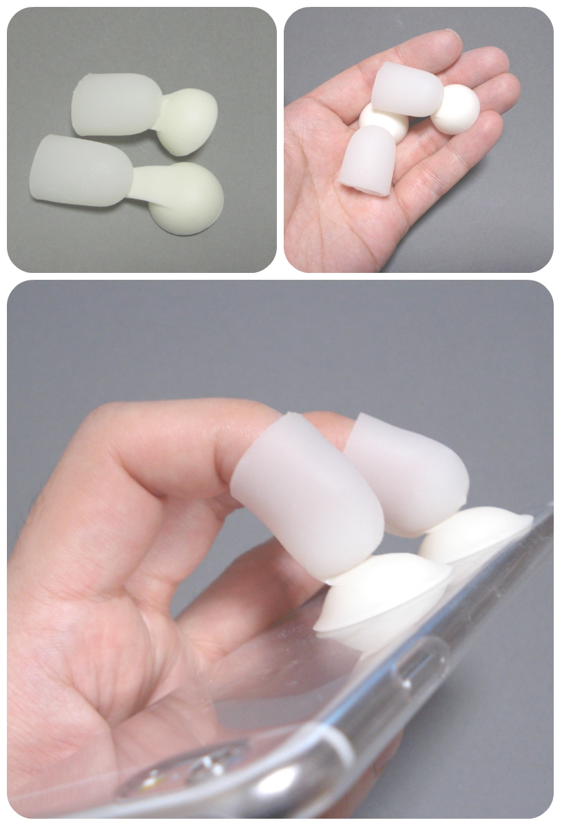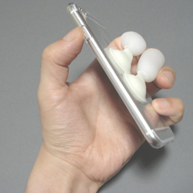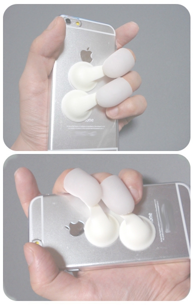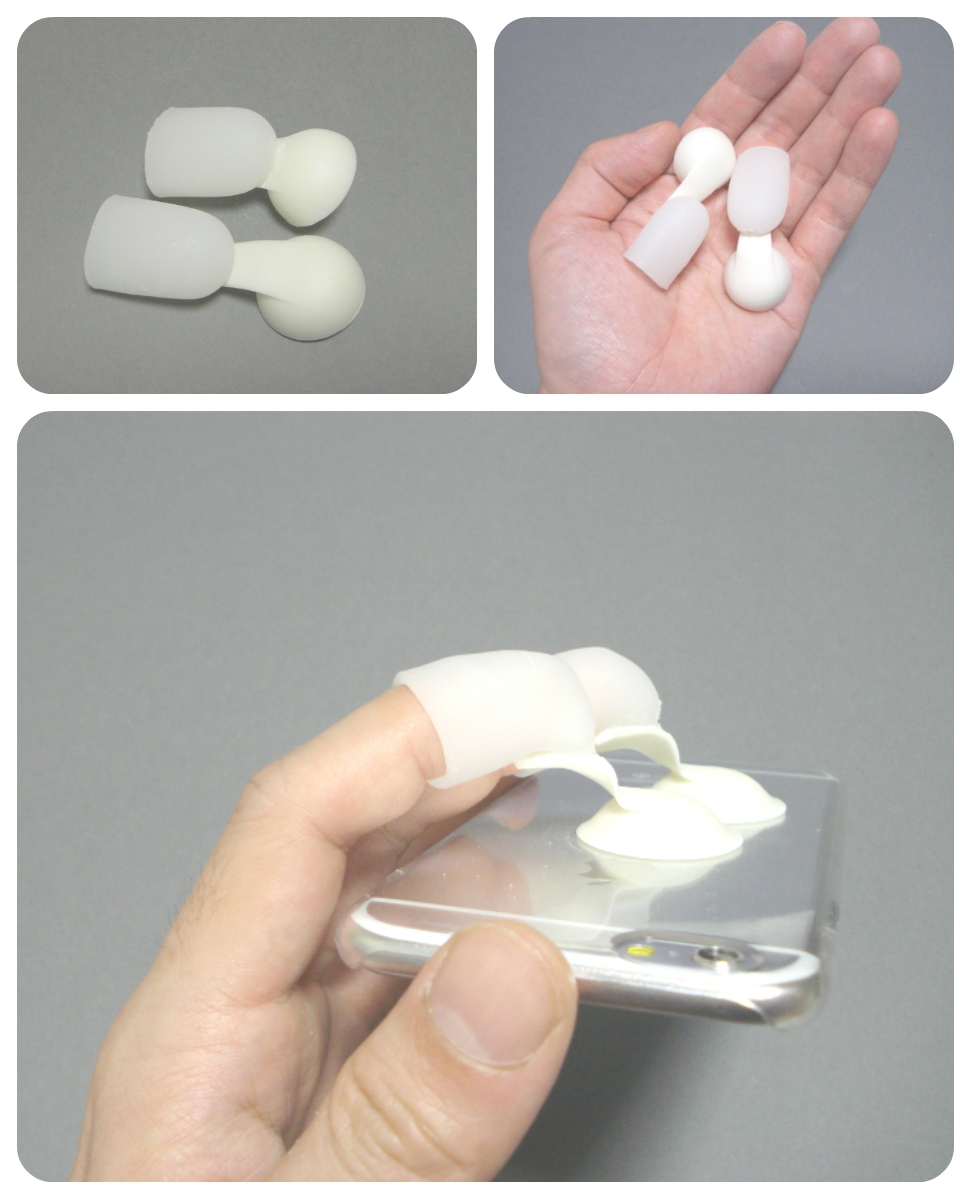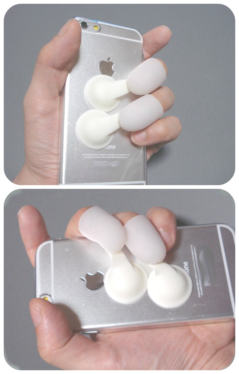 ポケット端末用ストラップ。吸盤の付いたキャップに指を入れ、端末の操作を補助する。端末を縦向き、横向きに持ち替えが容易で、落下防止も兼ねる。