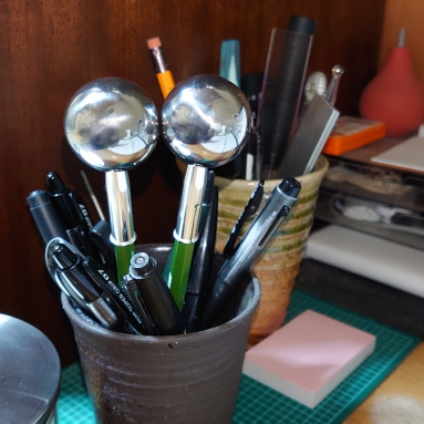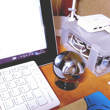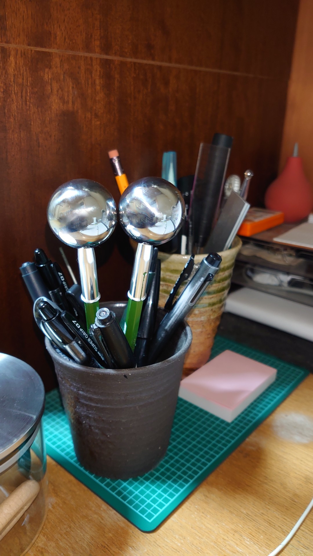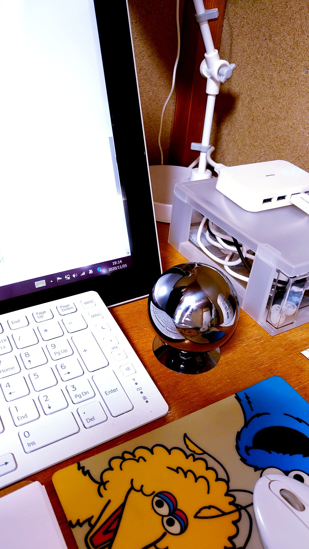 身近に鏡面球を置く利点・自分が写る鏡を客観視で集中力アップ。・周りの様子が、"何となく"分かる安心感。・360度反射なので、特定の人へのプレッシャーにならない。